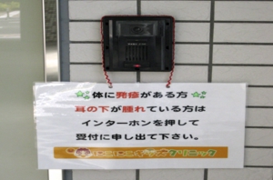 みずぼうそう・はしかなどの発疹(ブツブツ)のある方、おたふくかぜの様に耳の下が腫れている方は、インターホンを鳴らしてからお入りください。